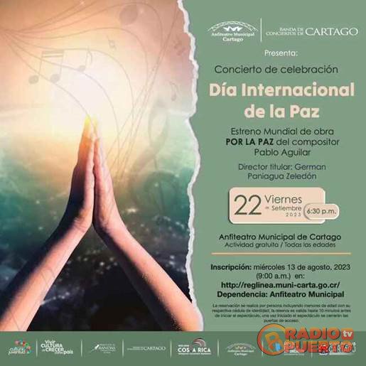 Concierto en celebración del Día Internacional de la Paz. Con el estreno mundial de las obras “Por la Paz” y “El sueño de las Américas” del compositor Pablo Aguilar, director titular: German Paniagua Zeledón. El 22, 6:30 p. m., Anfiteatro Municipal de Cartago.