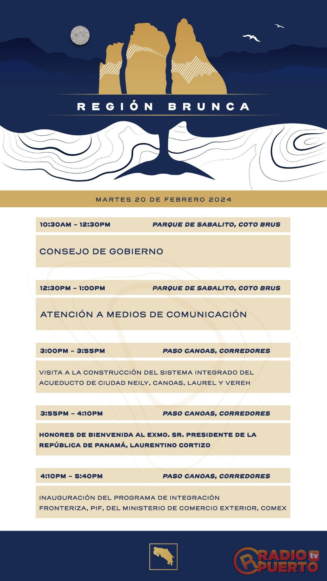 Este martes 20 de febrero. El Presidente de la República, Rodrigo Chaves Robles, recibirá a su homólogo panameño, Laurentino Cortizo, durante la gira que realizará por la región Brunca. La visita del Excmo. Sr. Laurentino Cortizo, Presidente de la República de Panamá se dará en el Centro de Control Integrado de Paso Canoas. En el sitio, ambos mandatarios recorrerán las instalaciones, acompañados por sus delegaciones. Posteriormente, harán el corte de cinta para inaugurán la infraestructura. respectivas Luego del acto protocolario, los Presidentes mantendrán una reunión bilateral en el Centro de Control Integrado. La visita del Presidente de la República de Panamá concluirá con la atención a medios de comunicación que realizará en dicho centro, en conjunto con el Presidente de Costa Rica.