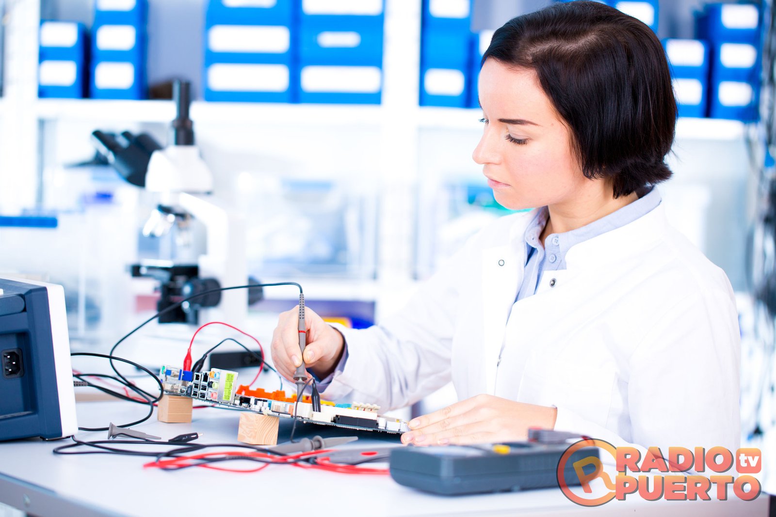 Girl repairing electronic device on the circuit board.